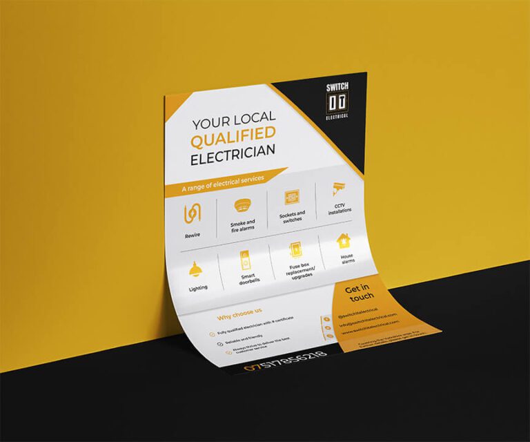 Following the successful completion of a logo design project for Switch It Electrical, I was commissioned to extend my creative services by creating a printed flyer to promote their business. After consulting with the client to grasp their needs, I utilised Photoshop and Illustrator to create a compelling flyer tailored to attract potential customers. The client expressed great satisfaction with the flyer, and within a few weeks, reported an increase in business inquiries attributed to the flyer’s effectiveness.